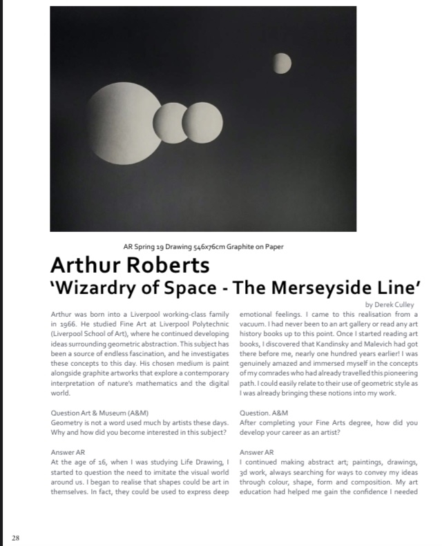 Arthur was born into a Liverpool working-class family in 1966. He studied Fine Art at Liverpool Polytechnic (Liverpool School of Art) where he continued developing ideas surrounding geometric abstraction. This subject has been a source of endless fascination and he investigates these concepts to this day. His chosen medium is paint alongside graphite artworks which explore a contemporary interpretation of both the mathematics of nature and the digital world.